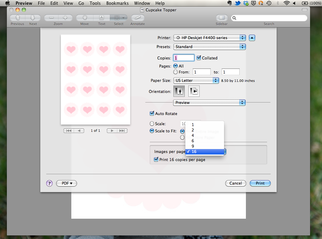 - Change the ‘Scale to fit’ option to however many cupcake toppers you would like per page. You can also make them larger by decreasing or increasing the scale. Also, check the print to page option.