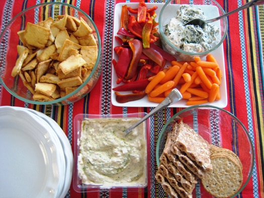 Green chiles add a little kick to this artichoke dip. Perfect for the day. Not only can you slice the baguette hours before serving, but you can also mix up the dip and store it in the refrigerator until serving time