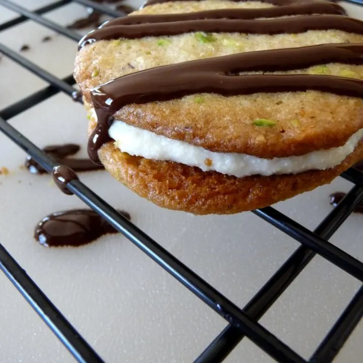 Cannoli Cookies are a tasty twist on the traditional cannoli recipe. Cannoli filling is sandwiched between two orange pistachio cookies and drizzled with dark chocolate.