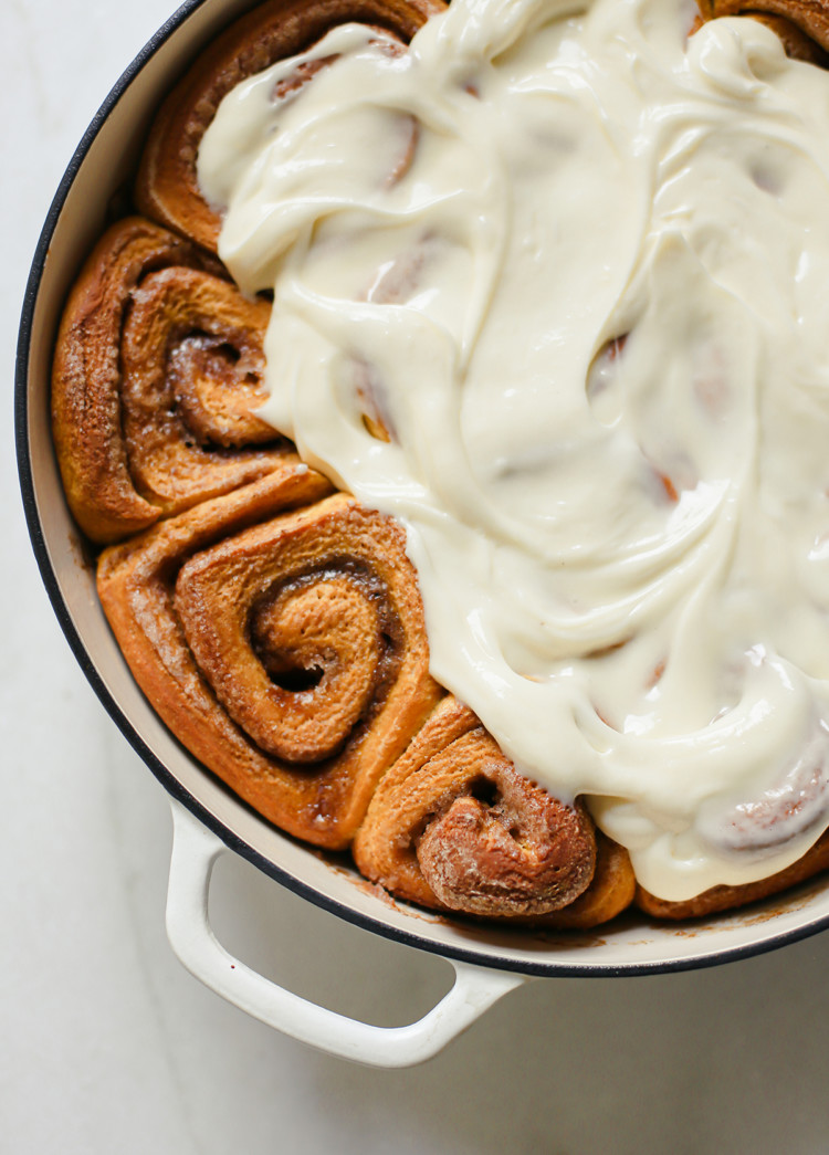 - Serve with glaze and dig in. You can either drizzle the cream cheese glaze over top à la a cinnamon roll or you can serve it on the side for dunking.