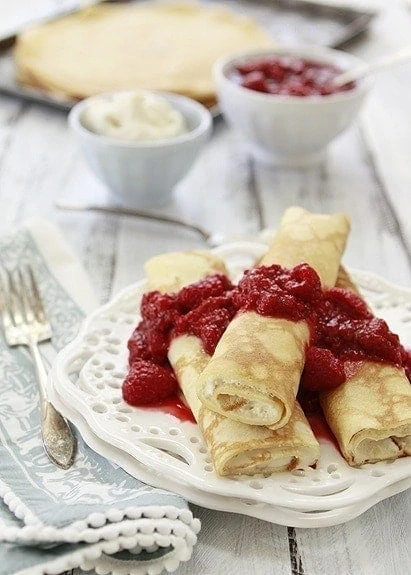 - Spread one side of each crepe with the ricotta mixture. Roll up and top with raspberries.