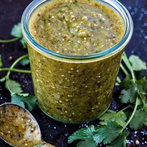This easy roasted salsa verde takes just a few minutes to prep once you've roasted the veggies. It is perfect for homemade green enchilada sauce, smothered burritos, or simply as a green salsa to serve with chips.