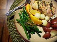 Ever since reading about roasting citrus at The Kitchn I have wanted to try it. I googled something like “citrus roasted chicken,” then looked at the image results, since it’s all about the picture for me. I found one that looked super yummy, and the recipe sounded great. But, I’ve had my share of disappointments in the past when baking or roasting boneless, skinless chicken breasts. Words that come to mind are: dry, boring, no flavor, tough…I proceeded with caution and decided to add a quick brining process to (hopefully) keep the chicken moist, or at least moister. I thought it was quite pretty all assembled with the citrus wedges and the thyme stuffed chicken.