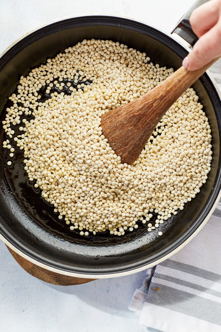 - When the pan is hot and the oil is shimmering, add the pearl couscous and stir. Cook over medium heat, while stirring, for about 2 minutes.