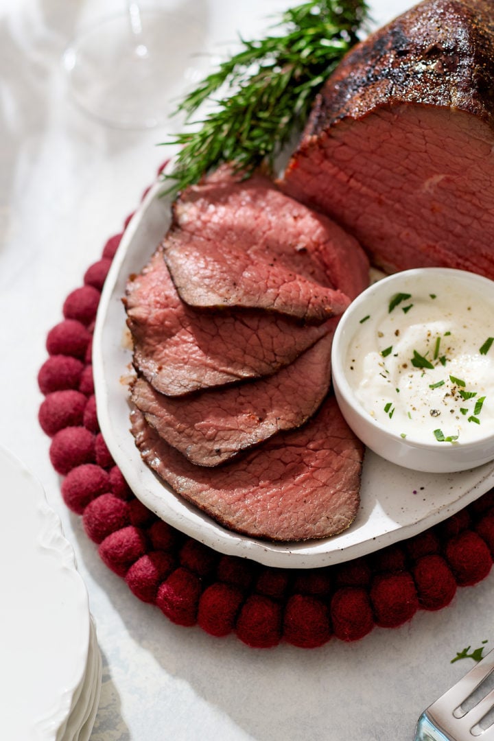 - Aim for slices about ⅛ inch thick, which will be tender even with this lean cut. Arrange the slices on a platter and serve with your horseradish sauce alongside.