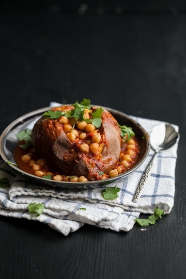 Love this recipe for Spiced Chickpea Smothered Sweet Potato?