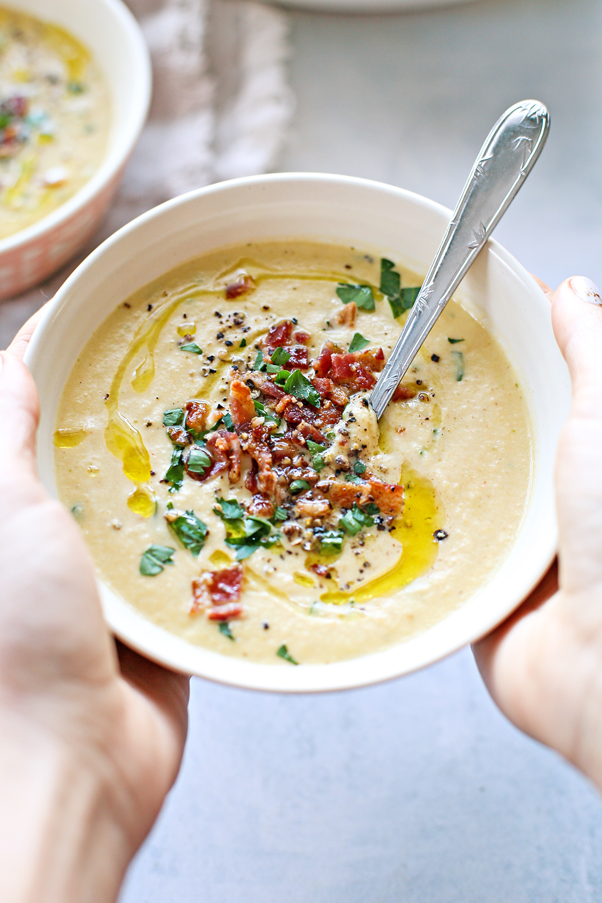 "This Roasted Cauliflower Soup is thick, creamy, and flavorful without being loaded down with heavy cream. I served the cauliflower soup with bacon for added flavor!"